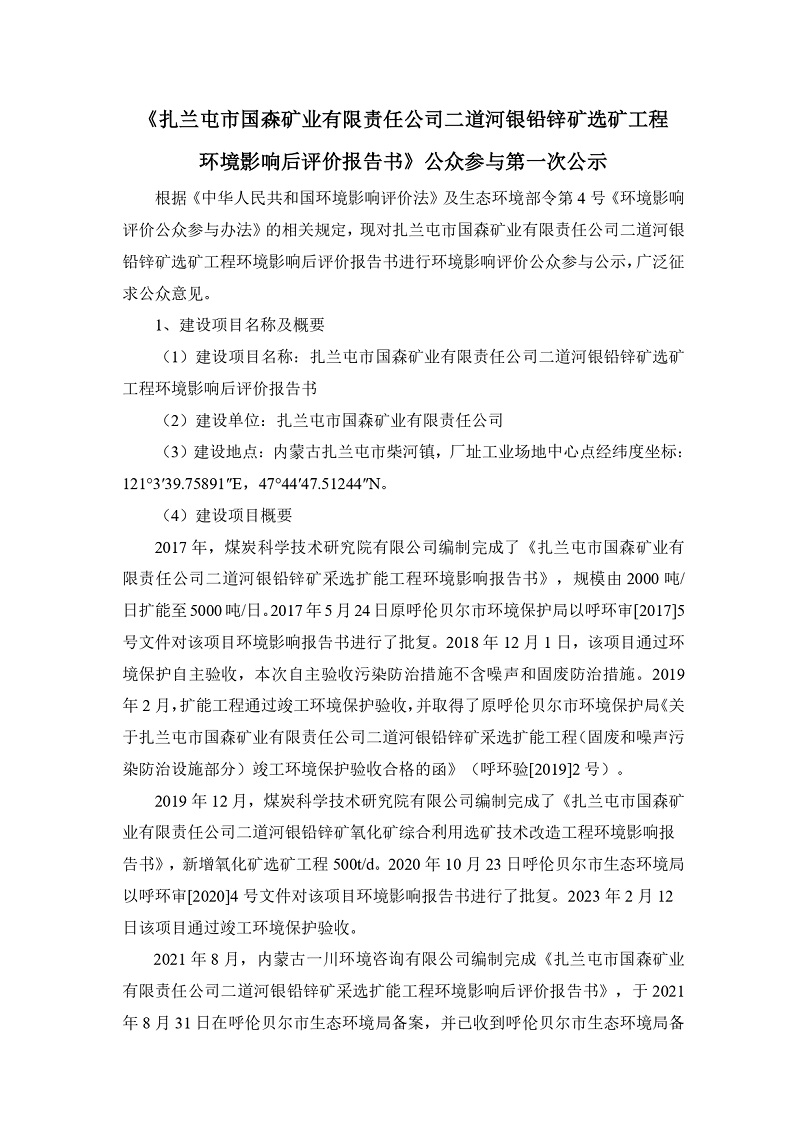 《扎蘭屯市國森礦業(yè)有限責(zé)任公司二道河銀鉛鋅礦選礦工程環(huán)境影響后評價報告書》公眾參與第一次公示